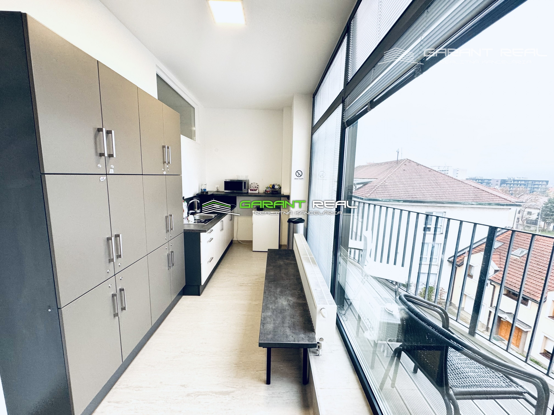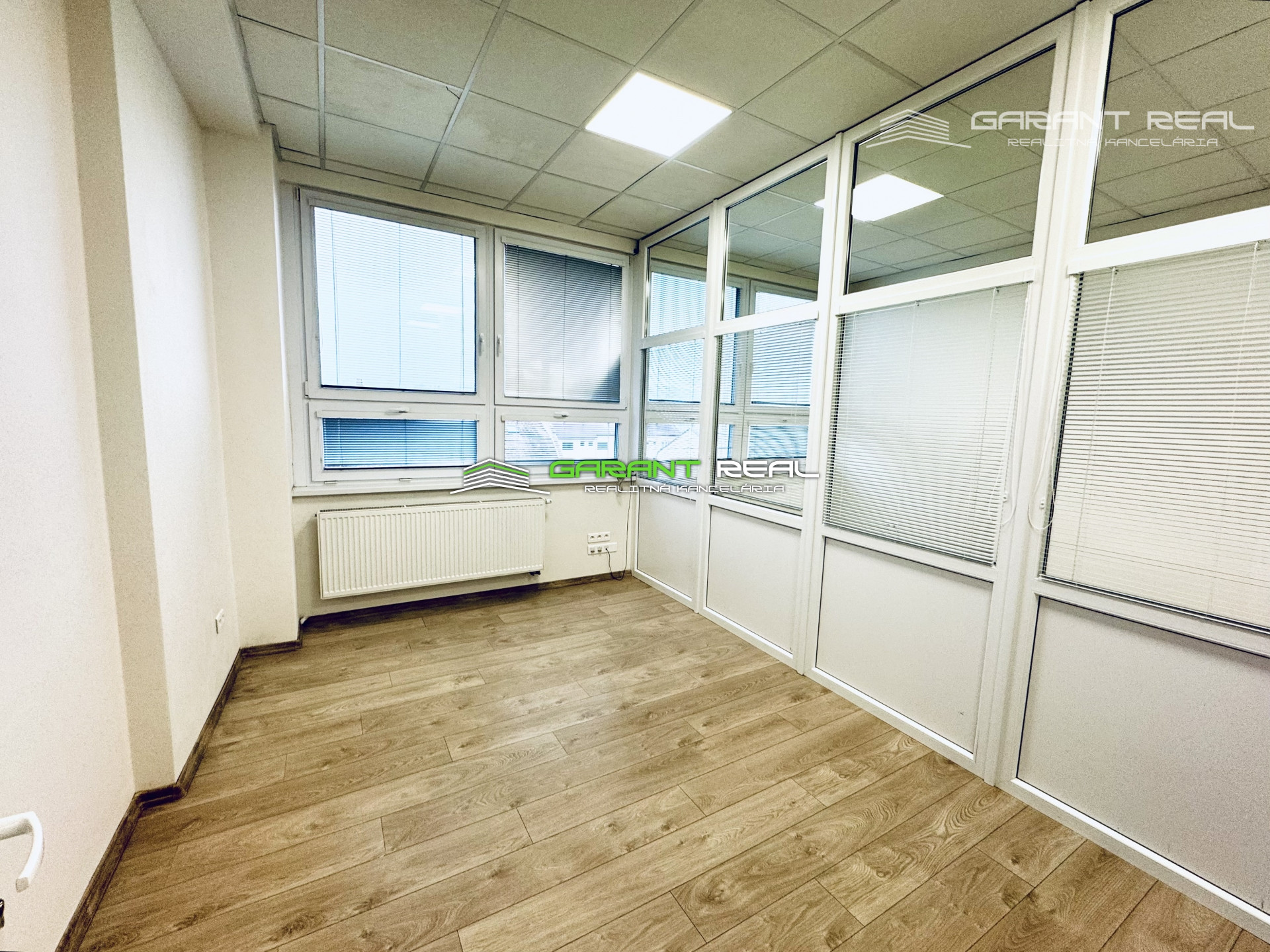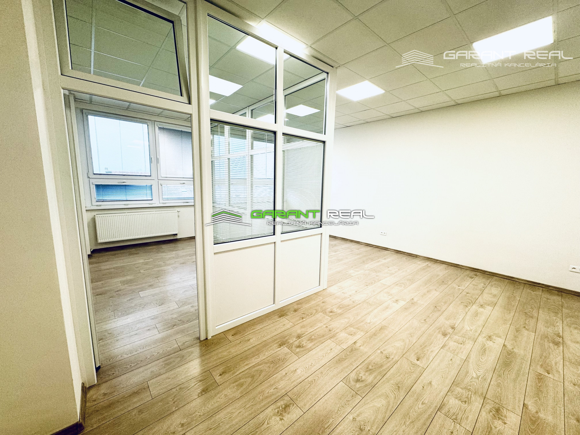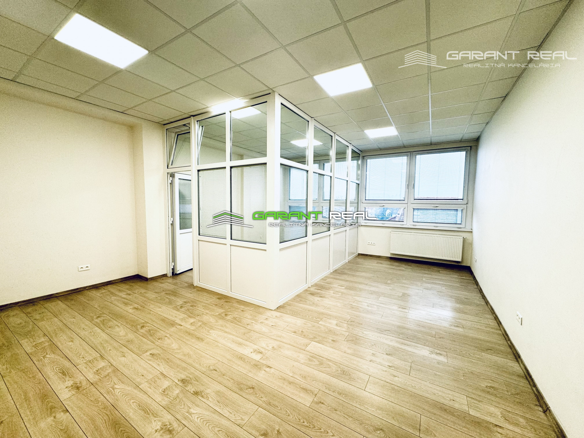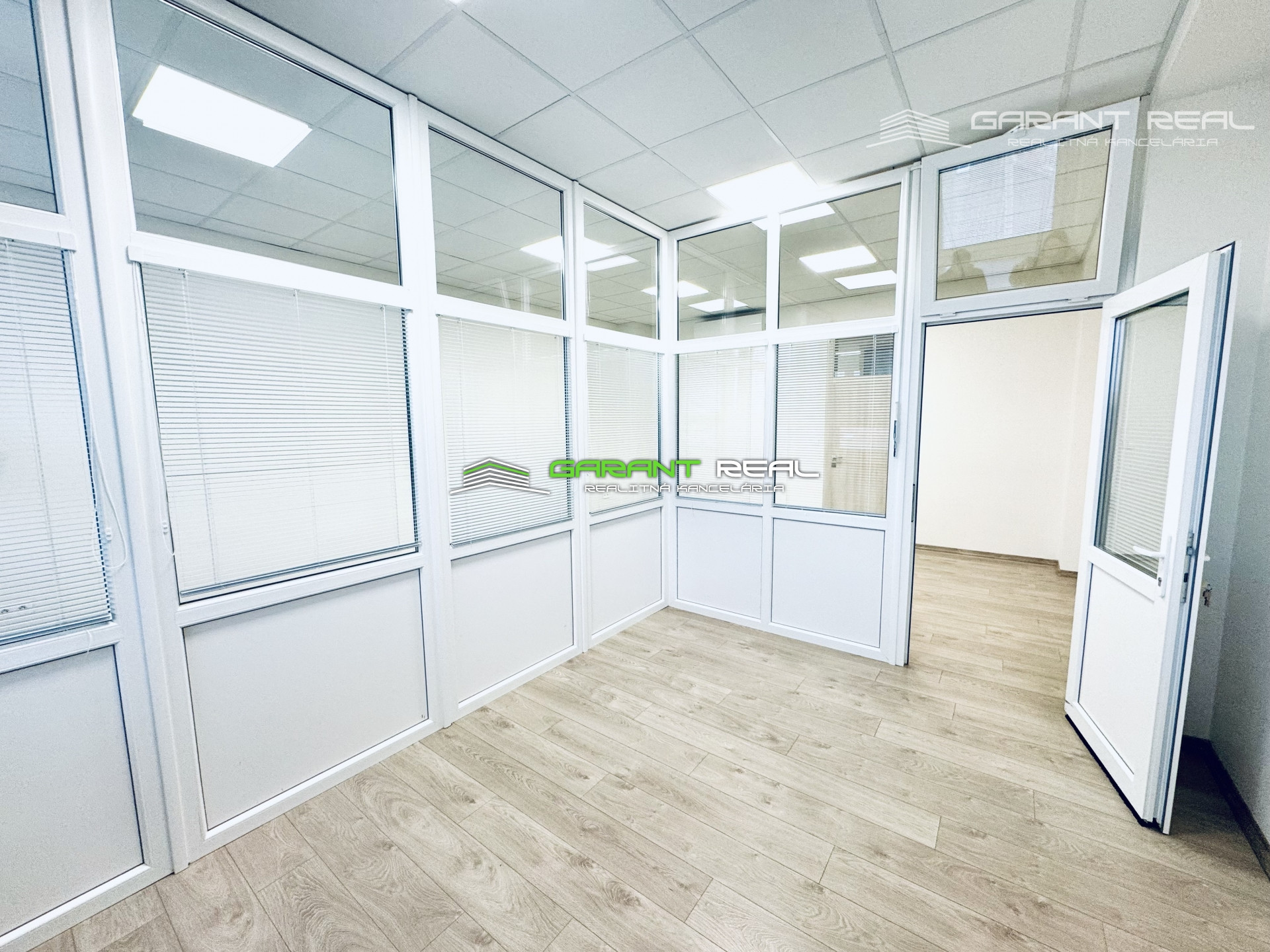 - miestnosť o výmere 43 m2 má v sebe oddelenú presklenú miestnosť cca o výmere 14 m2, čím vznikli 2 prepojené miestnosti