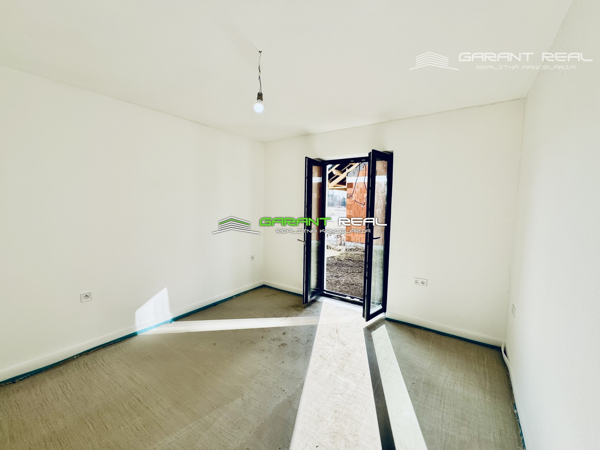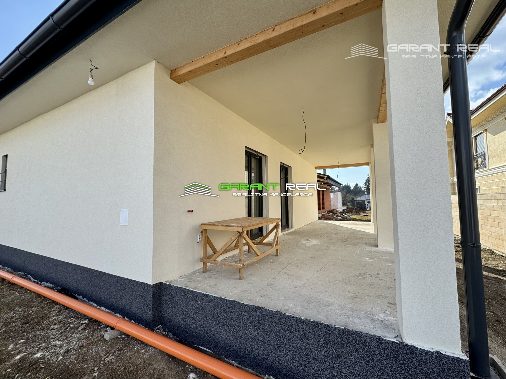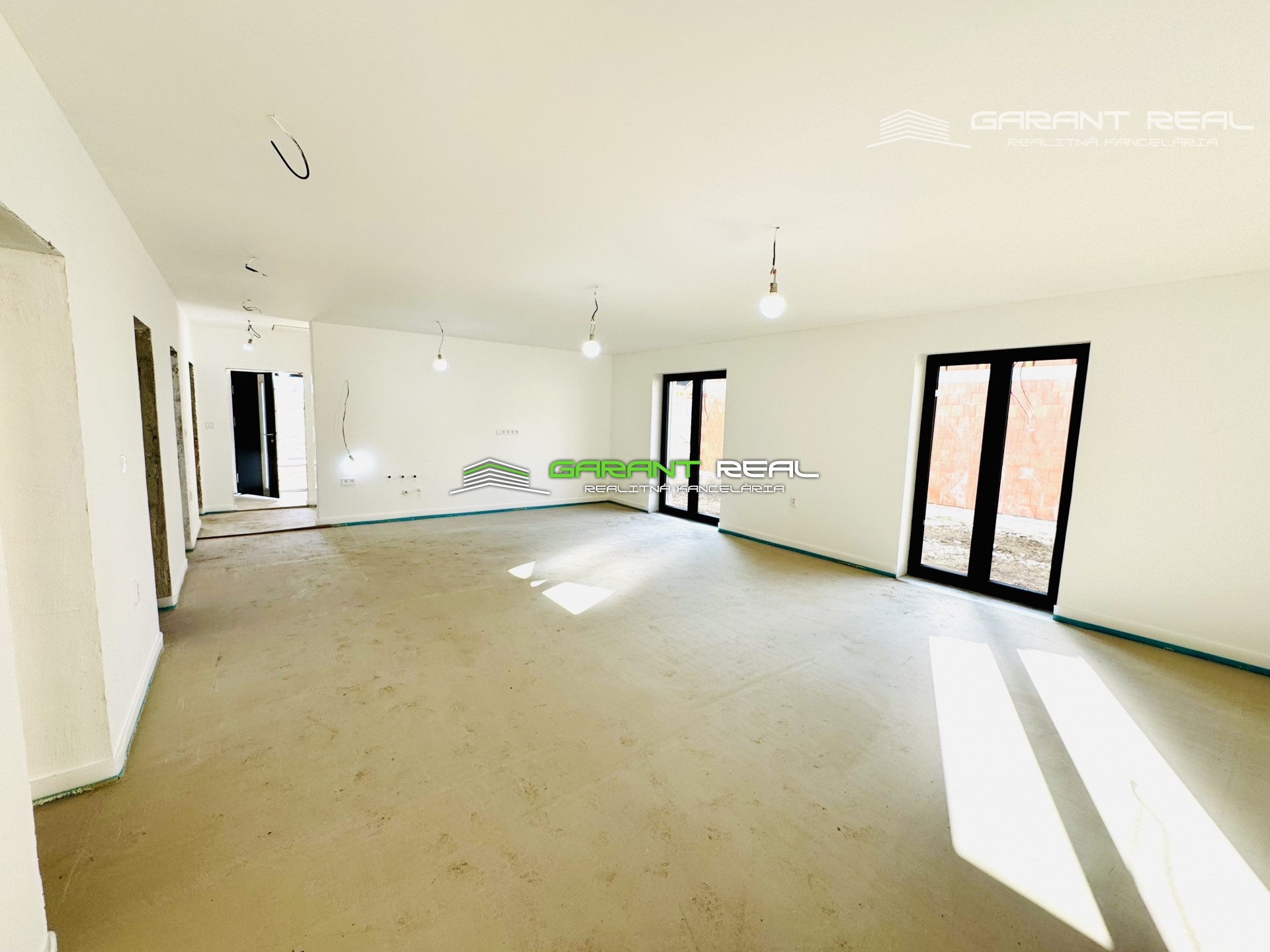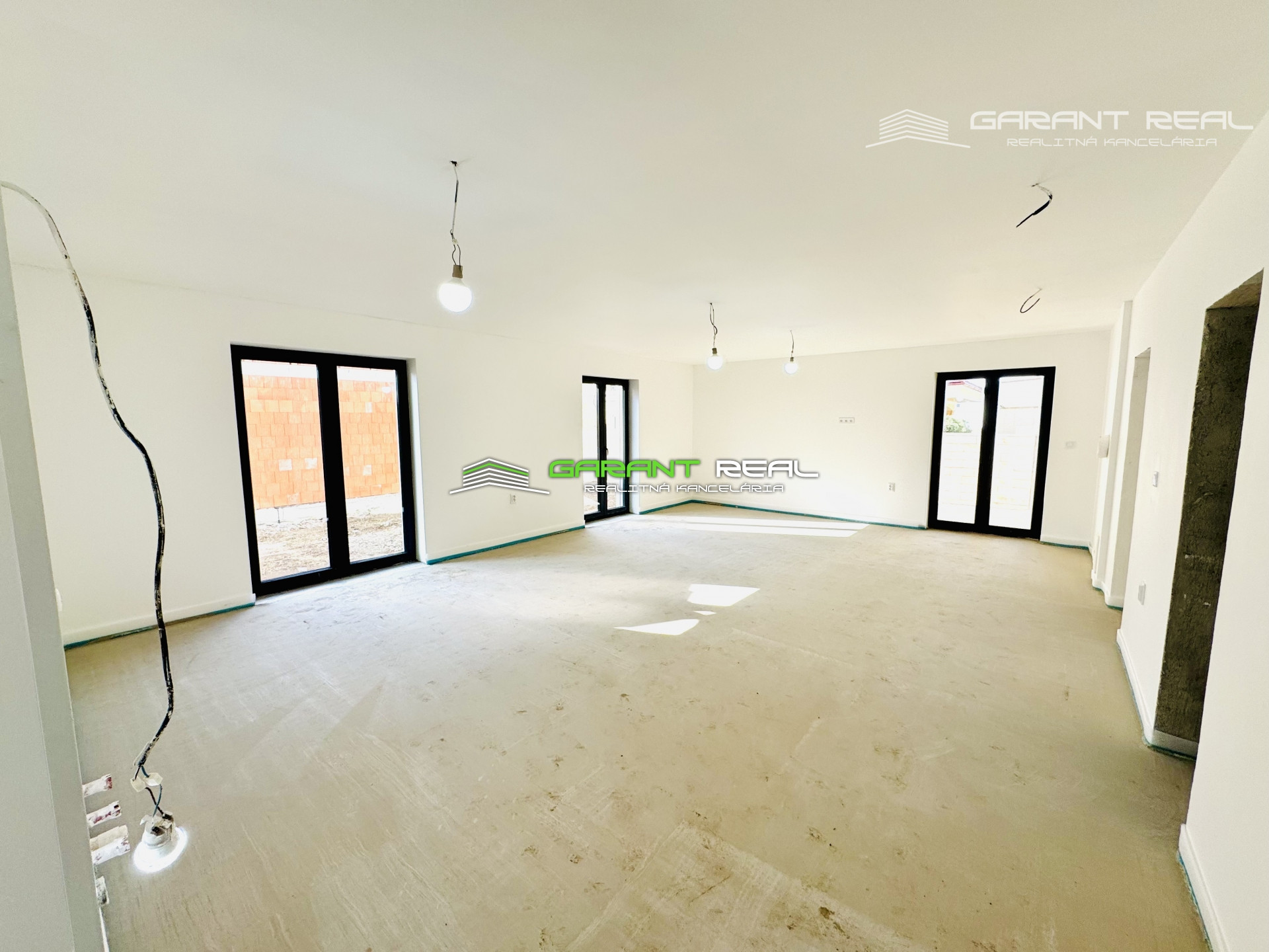 - dom je v súčasnosti so základnou nivelizačnou vrstvou podlahy, bez dverí, bez zárubní, bez vrchnej vrstvy podláh, vypínače a zásuvky sú namontované, s predprípravou na montáž kuchynskej linky, avšak bez kuchynského nábytku a sanity v kúpeľni, 2 x WC - Geberit bude nainštalované