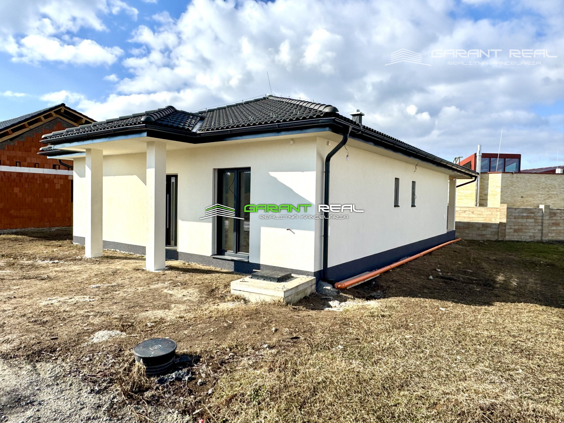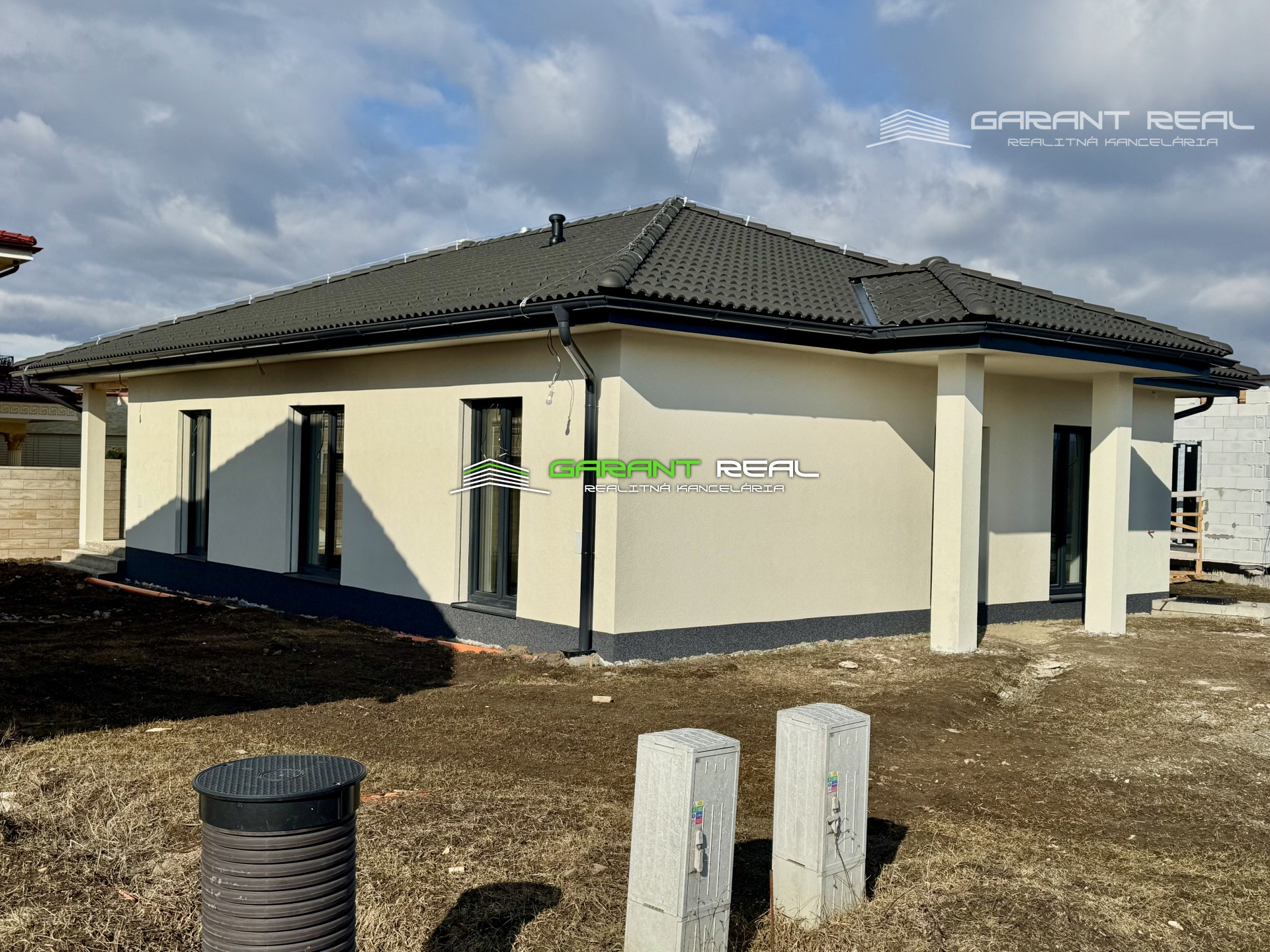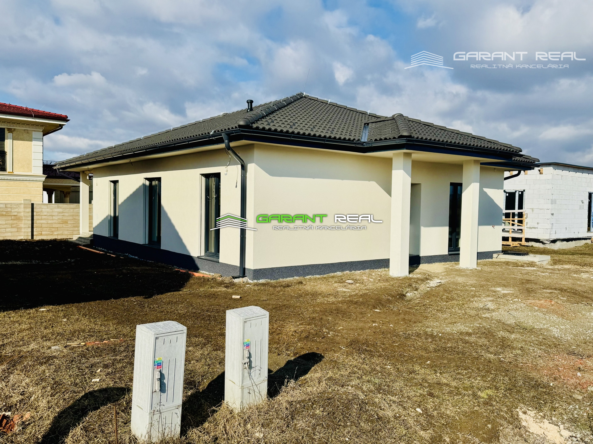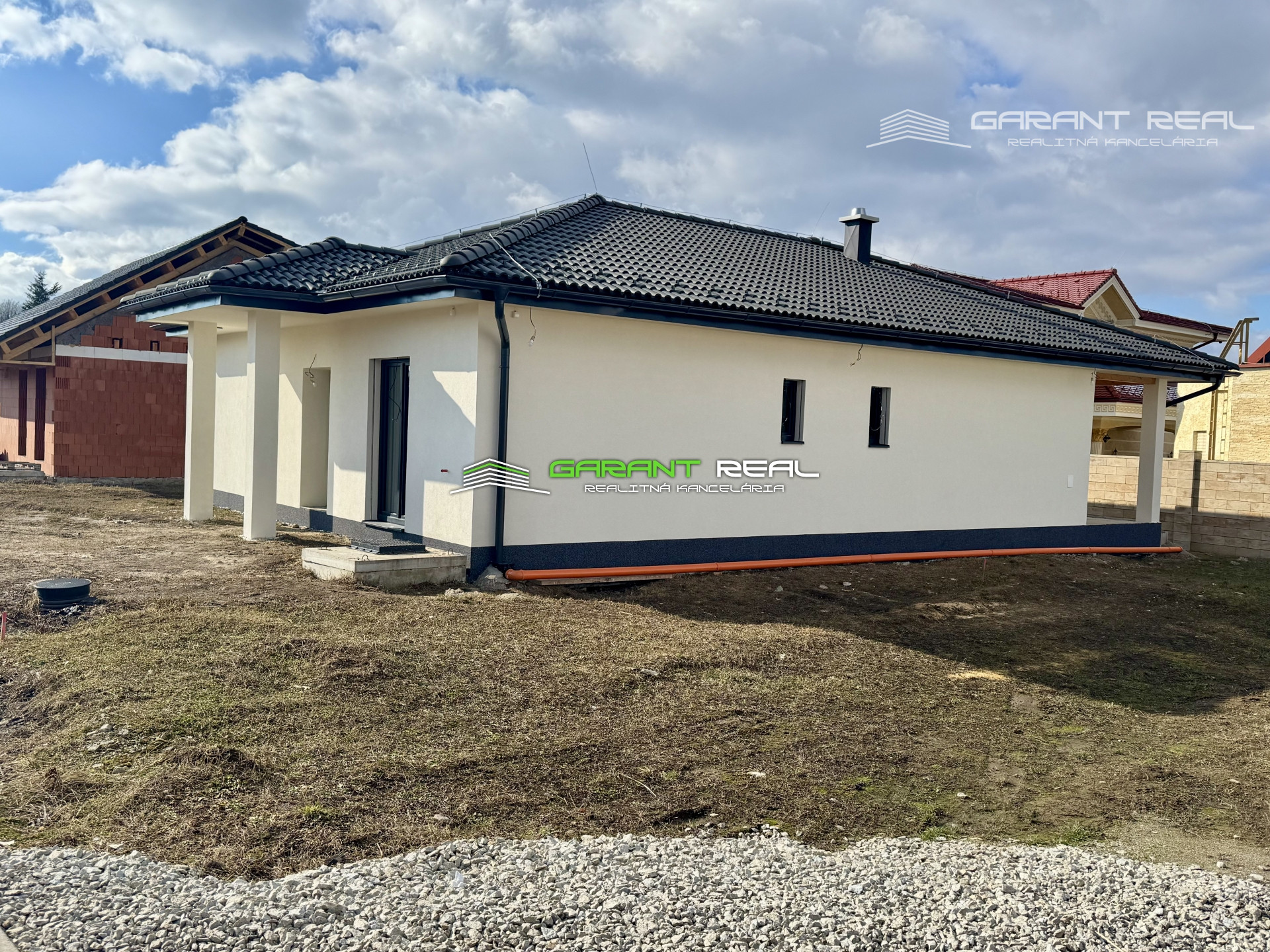 - dom je v súčasnosti so základnou nivelizačnou vrstvou podlahy, bez dverí, bez zárubní, bez vrchnej vrstvy podláh, vypínače a zásuvky sú namontované, s predprípravou na montáž kuchynskej linky, avšak bez kuchynského nábytku a sanity v kúpeľni, 2 x WC - Geberit bude nainštalované