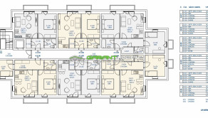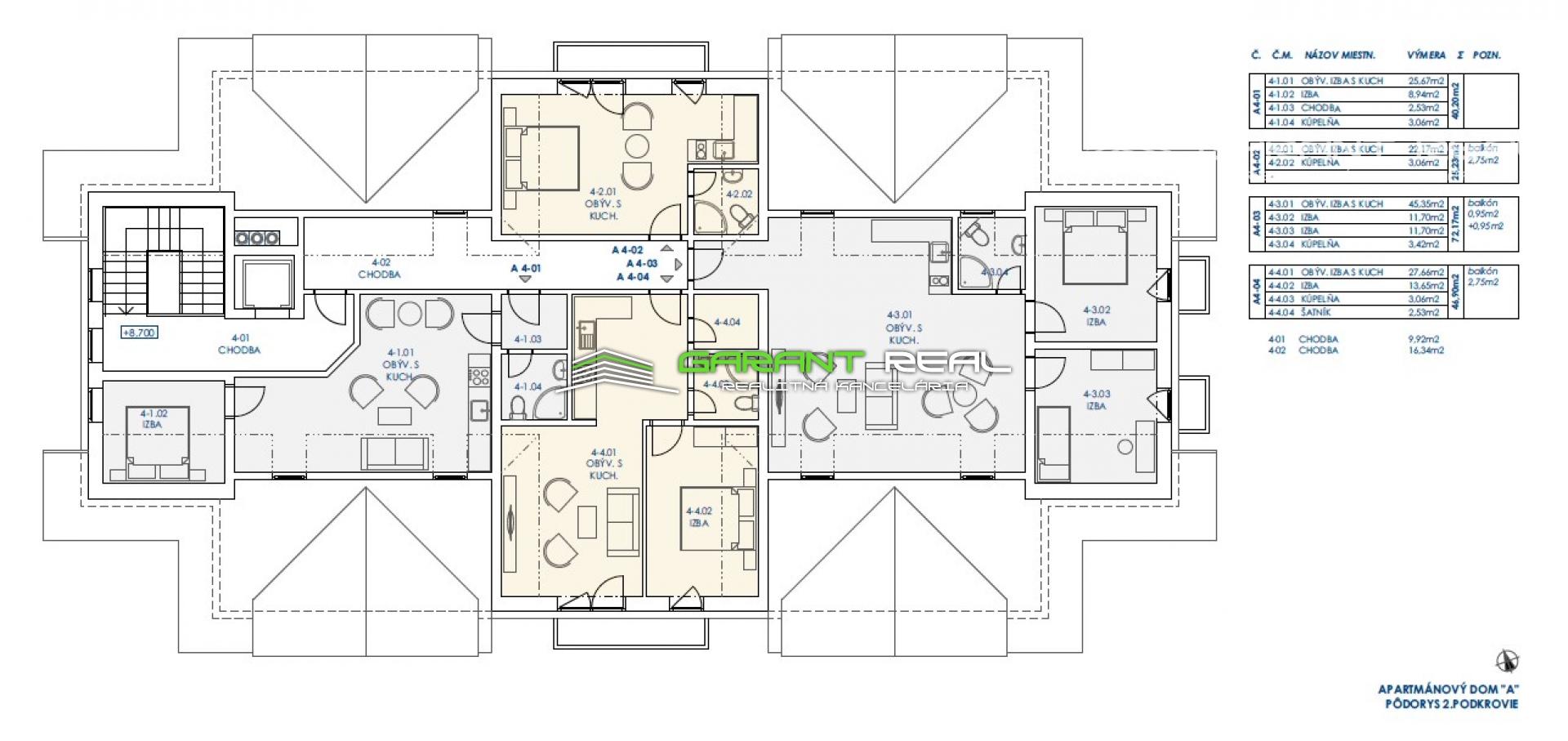 Každý apartmánový dom je 3 podlažný s využitým podkrovím sedlovej strechy, obsahuje 22, resp. 25 apartmánov.